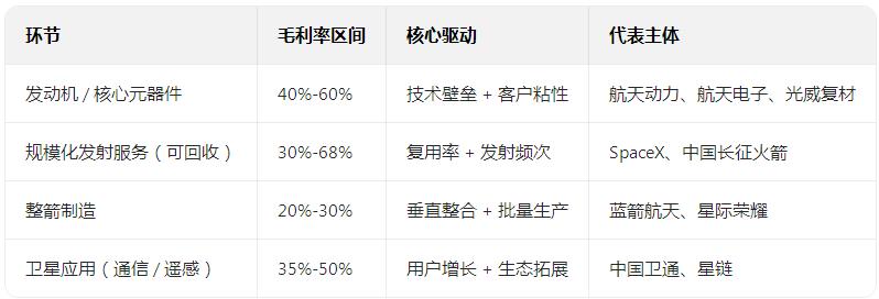 火箭产业链最挣钱的环节,按盈利强度与规模综合看,当前核心集中在上游推进系统(发动机)、高壁垒核心元器件 / 材料,以及中游规模化发射服务(可回收技术驱动),而下游卫星应用(如星链)是长期最大盈利极。以下按环节拆解核心逻辑与盈利表现: 一、上游核心部件:技术壁垒高,毛利率 “顶流” 推进系统(发动机) 价值量占火箭总成本约 50%,是绝对的成本与利润核心。液体发动机(如液氧甲烷 / 煤油)技术壁垒最高,单台价值量可达数千万元,头部企业毛利率稳定在 40%-60%。以 SpaceX 猎鹰 9 为例,一子级(含发动机)成本占单箭总成本 66%,回收复用 10 次以上可将单发成本大幅摊薄,毛利率最高达 68%。国内航天动力、蓝箭航天等企业在该环节掌握定价权。 核心元器件与高端材料 惯性导航、测控通信、耐高温复合材料等,技术壁垒极高,毛利率普遍超 50%,显著高于整箭制造与发射服务。如航天电子的惯导产品、光威复材的碳纤维材料,客户粘性强,是利润 “稳定器”。发动机推力室、喷管等关键材料(如耐高温铜合金)价值量占发动机总成本 12%-30%,因极端工况需求,溢价能力突出。 箭体结构与关键配套 贮箱、整流罩等结构件价值量占比约 20%-25%,但毛利率多在 25%-35%,低于核心元器件与发动机;可回收火箭的整流罩检修、着陆缓冲系统等,随复用率提升,成为新增盈利点。 二、中游发射服务:规模 + 复用驱动,利润弹性最大 发射服务是现金流核心,单次发射合同额可达数千万至数亿美元,毛利率随发射频次与复用率显著提升。传统一次性火箭发射毛利率约 20%-30%,而可回收火箭(如猎鹰 9)复用 5 次后毛利率可达 60% 以上,复用 15 次时固定成本基本摊薄,边际利润接近收入。SpaceX 凭借全球 90% 的发射份额与年发射超 170 次的规模,发射服务年营收约 55 亿美元,支撑其技术迭代与生态扩张。国内头部企业如中国长征火箭、蓝箭航天,通过绑定低轨星座订单,正快速释放规模效应。 三、下游卫星应用:长期 “现金牛”,生态化盈利 卫星通信、遥感、导航等应用是产业链的 “终极盈利池”,规模远超火箭制造与发射。以 SpaceX 星链为例,2025 年营收达 123 亿美元,已实现规模化盈利,用户超 800 万,手机直连卫星等新场景进一步打开增长空间。该环节毛利率稳定在 35%-50%,且用户粘性强,是长期最大盈利极,也是头部企业构建壁垒的关键。 四、整箭制造:利润薄但现金流稳定 整箭制造毛利率多在 20%-30%,低于上游核心部件与下游应用,核心原因是固定成本高、竞争加剧导致价格战。但头部企业通过垂直整合(如自研发动机)、批量生产,可将毛利率提升至 30% 以上,且依靠稳定订单(如低轨星座组网),现金流充裕,支撑上游研发与下游服务拓展。 盈利强度对比(2025 年数据) |