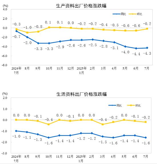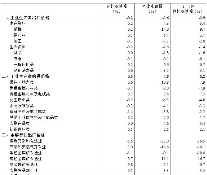 2025年7月份,全国工业生产者出厂价格环比下降0.2%,工业生产者购进价格环比下降0.3%,降幅比上月分别收窄0.2个和0.4个百分点。工业生产者出厂价格同比下降3.6%,工业生产者购进价格同比下降4.5%。1—7月平均,工业生产者出厂价格比上年同期下降2.9%,工业生产者购进价格下降3.2%。 一、工业生产者价格同比变动情况 7月份,工业生产者出厂价格中,生产资料价格下降4.3%,影响工业生产者出厂价格总水平下降约3.20个百分点。其中,采掘工业价格下降14.0%,原材料工业价格下降5.4%,加工工业价格下降3.1%。生活资料价格下降1.6%,影响工业生产者出厂价格总水平下降约0.42个百分点。其中,食品价格下降1.8%,衣着价格下降0.1%,一般日用品价格上涨0.6%,耐用消费品价格下降3.5%。 工业生产者购进价格中,燃料动力类价格下降10.8%,黑色金属材料类价格下降8.0%,化工原料类价格下降6.5%,农副产品类价格下降4.6%,建筑材料及非金属类价格下降3.8%,纺织原料类价格下降2.5%;有色金属材料及电线类价格上涨2.8%。 二、工业生产者价格环比变动情况 7月份,工业生产者出厂价格中,生产资料价格下降0.2%,影响工业生产者出厂价格总水平下降约0.17个百分点。其中,采掘工业价格下降0.2%,原材料工业价格下降0.1%,加工工业价格下降0.3%。生活资料价格下降0.2%,影响工业生产者出厂价格总水平下降约0.06个百分点。其中,食品价格持平,衣着价格下降0.1%,一般日用品价格下降0.2%,耐用消费品价格下降0.6%。 工业生产者购进价格中,建筑材料及非金属类价格下降1.4%,黑色金属材料类价格下降0.7%,燃料动力类价格下降0.6%,化工原料类价格下降0.5%,纺织原料类价格下降0.1%;农副产品类价格持平;有色金属材料及电线类价格上涨0.7%。 2025年7月工业生产者价格主要数据 |