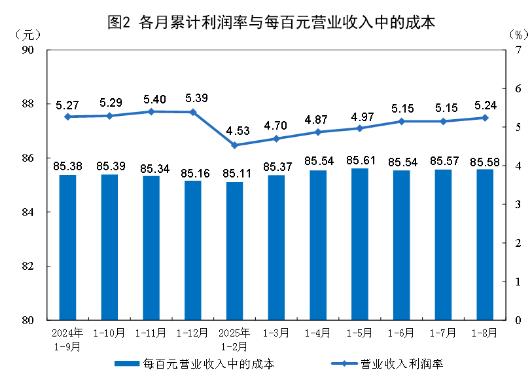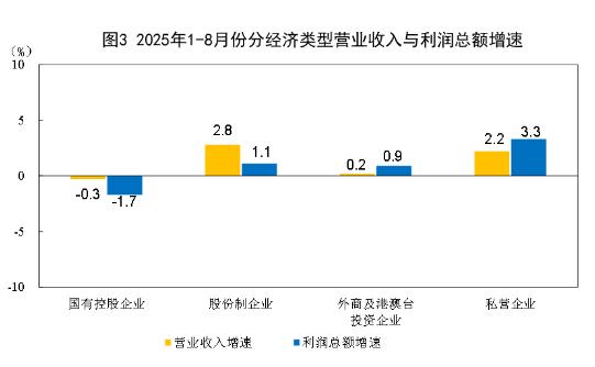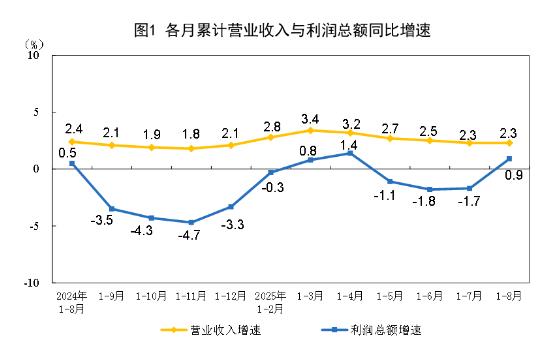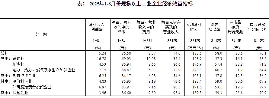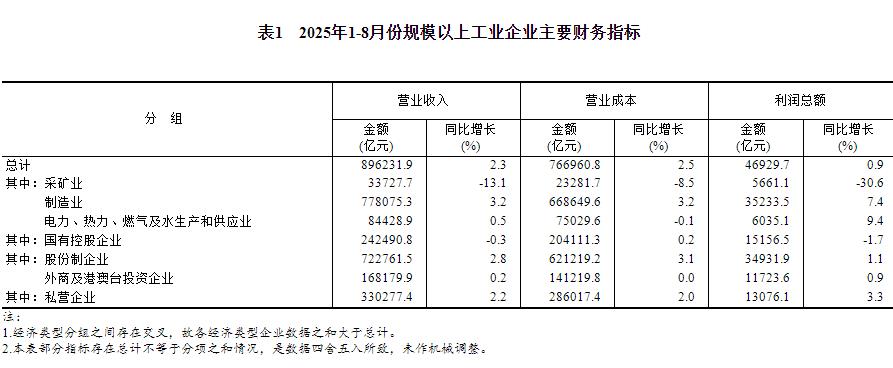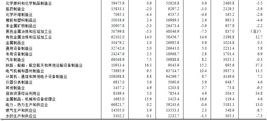 1—8月份,全国规模以上工业企业实现利润总额46929.7亿元,同比增长0.9%(按可比口径计算,详见附注二)。 1—8月份,规模以上工业企业中,国有控股企业实现利润总额15156.5亿元,同比下降1.7%;股份制企业实现利润总额34931.9亿元,增长1.1%;外商及港澳台投资企业实现利润总额11723.6亿元,增长0.9%;私营企业实现利润总额13076.1亿元,增长3.3%。 1—8月份,采矿业实现利润总额5661.1亿元,同比下降30.6%;制造业实现利润总额35233.5亿元,增长7.4%;电力、热力、燃气及水生产和供应业实现利润总额6035.1亿元,增长9.4%。 1—8月份,主要行业利润情况如下:电力、热力生产和供应业利润同比增长13.0%,有色金属冶炼和压延加工业增长12.7%,农副食品加工业增长11.8%,电气机械和器材制造业增长11.5%,计算机、通信和其他电子设备制造业增长7.2%,专用设备制造业增长6.9%,通用设备制造业增长5.8%,石油煤炭及其他燃料加工业同比减亏,黑色金属冶炼和压延加工业同比由亏转盈,汽车制造业下降0.3%,非金属矿物制品业下降2.2%,化学原料和化学制品制造业下降5.5%,纺织业下降7.0%,石油和天然气开采业下降12.4%,煤炭开采和洗选业下降53.6%。 1—8月份,规模以上工业企业实现营业收入89.62万亿元,同比增长2.3%;发生营业成本76.70万亿元,增长2.5%;营业收入利润率为5.24%,同比下降0.06个百分点。 8月末,规模以上工业企业资产总计185.08万亿元,同比增长5.0%;负债合计107.34万亿元,增长5.4%;所有者权益合计77.73万亿元,增长4.4%;资产负债率为58.0%,同比上升0.2个百分点。 8月末,规模以上工业企业应收账款27.24万亿元,同比增长6.6%;产成品存货6.73万亿元,增长2.3%。 1—8月份,规模以上工业企业每百元营业收入中的成本为85.58元,同比增加0.19元;每百元营业收入中的费用为8.37元,同比减少0.08元。 8月末,规模以上工业企业每百元资产实现的营业收入为74.0元,同比减少2.0元;人均营业收入为183.5万元,同比增加5.7万元;产成品存货周转天数为20.5天,同比增加0.1天;应收账款平均回收期为70.1天,同比增加3.7天。 8月份,规模以上工业企业利润同比由上月下降1.5%转为增长20.4%。 |