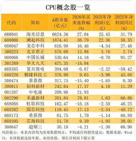AI算力需求持续爆发之际,CPU(中央处理器)行业或掀起新一轮涨价潮。据媒体报道,近日,有ODM厂商(原始设计制造厂商)表示,自今年3月起,消费电子及服务器CPU价格涨幅分别达5%~10%及10%~20%。供应链透露,国际大厂酝酿三季度再进行新一轮涨价。A股市场涉及CPU相关业务的上市公司数量不到20家。截至4月24日收盘,概念股合计A股市值达到1.29万亿元。海光信息、澜起科技、龙芯中科是CPU概念三大核心标的,其中海光信息A股市值最高,达到6624.36亿元。 从机构关注度方面来看,今年以来共有13只CPU概念股获得机构调研。5股获机构调研3次及以上,分别是复旦微电、国芯科技、龙芯中科、北京君正、希荻微。 A 股直接设计 / 生产 CPU 的上市公司,按架构与定位分如下(截至 2026-04-25): 一、服务器 / 通用 CPU(核心龙头) 海光信息 (688041) 架构:x86(永久授权) 产品:海光 1-5 号服务器 CPU、DCU(AI 算力) 优势:国产 x86 市占第一,兼容 Intel 生态,金融 / 电信 / 互联网主力 龙芯中科 (688047) 架构:LoongArch(全自主指令集) 产品:3C6000(服务器)、3A5000/6000(桌面) 优势:党政 / 军工信创核心,自主可控程度最高 中国长城 (000066) 架构:ARM(控股飞腾信息) 产品:飞腾 FT-2000+/D2000(桌面 / 服务器) 优势:PKS 信创生态(飞腾 + 麒麟 + 安全),党政整机市占高 二、嵌入式 / 专用 CPU(工业 / 物联网) 国芯科技 (688262) 架构:RISC-V + 自主 产品:嵌入式 CPU、安全芯片、汽车电子 MCU 优势:工业控制 / 物联网 / 信创嵌入式替代主力 三、产业链配套(非直接生产 CPU,但核心关联) 澜起科技 (688008):服务器内存接口芯片(DDR5)全球龙头,CPU 核心配套 芯原股份 (688521):CPU/AI IP 核(RISC-V/x86/arm 授权) 中芯国际 (688981):晶圆代工(14nm/7nm),国产 CPU 主要代工厂 |