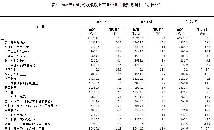 1—8月份,全国规模以上工业企业实现利润总额46929.7亿元,同比增长0.9%(按可比口径计算,详见附注二)。 1—8月份,规模以上工业企业中,国有控股企业实现利润总额15156.5亿元,同比下降1.7%;股份制企业实现利润总额34931.9亿元,增长1.1%;外商及港澳台投资企业实现利润总额11723.6亿元,增长0.9%;私营企业实现利润总额13076.1亿元,增长3.3%。 1—8月份,采矿业实现利润总额5661.1亿元,同比下降30.6%;制造业实现利润总额35233.5亿元,增长7.4%;电力、热力、燃气及水生产和供应业实现利润总额6035.1亿元,增长9.4%。 1—8月份,主要行业利润情况如下:电力、热力生产和供应业利润同比增长13.0%,有色金属冶炼和压延加工业增长12.7%,农副食品加工业增长11.8%,电气机械和器材制造业增长11.5%,计算机、通信和其他电子设备制造业增长7.2%,专用设备制造业增长6.9%,通用设备制造业增长5.8%,石油煤炭及其他燃料加工业同比减亏,黑色金属冶炼和压延加工业同比由亏转盈,汽车制造业下降0.3%,非金属矿物制品业下降2.2%,化学原料和化学制品制造业下降5.5%,纺织业下降7.0%,石油和天然气开采业下降12.4%,煤炭开采和洗选业下降53.6%。 1—8月份,规模以上工业企业实现营业收入89.62万亿元,同比增长2.3%;发生营业成本76.70万亿元,增长2.5%;营业收入利润率为5.24%,同比下降0.06个百分点。 8月末,规模以上工业企业资产总计185.08万亿元,同比增长5.0%;负债合计107.34万亿元,增长5.4%;所有者权益合计77.73万亿元,增长4.4%;资产负债率为58.0%,同比上升0.2个百分点。 8月末,规模以上工业企业应收账款27.24万亿元,同比增长6.6%;产成品存货6.73万亿元,增长2.3%。 1—8月份,规模以上工业企业每百元营业收入中的成本为85.58元,同比增加0.19元;每百元营业收入中的费用为8.37元,同比减少0.08元。 8月末,规模以上工业企业每百元资产实现的营业收入为74.0元,同比减少2.0元;人均营业收入为183.5万元,同比增加5.7万元;产成品存货周转天数为20.5天,同比增加0.1天;应收账款平均回收期为70.1天,同比增加3.7天。 8月份,规模以上工业企业利润同比由上月下降1.5%转为增长20.4%。 |